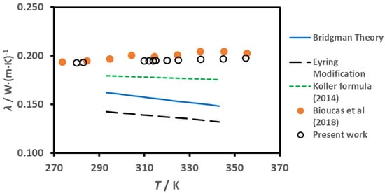 We applied Eyring modification of Bridgman’s model by using Equation (3) for our polyatomic ionic liquid, with γ obtained from Equation (3) for [C2mim][C2H5SO4] from [], and the values of the necessary properties for [C2mim][CH3SO3] at 0.1 MPa taken from []. It can be seen that the calculated value for the polyatomic liquid is around 30% lower than the experiment, with a negative variation with temperature, contrary to the positive slope found experimentally. In addition, Bridgman model generates a higher thermal conductivity than Eyring model, which is rather unusual, a fact already found by Bridgman in its original paper [].
