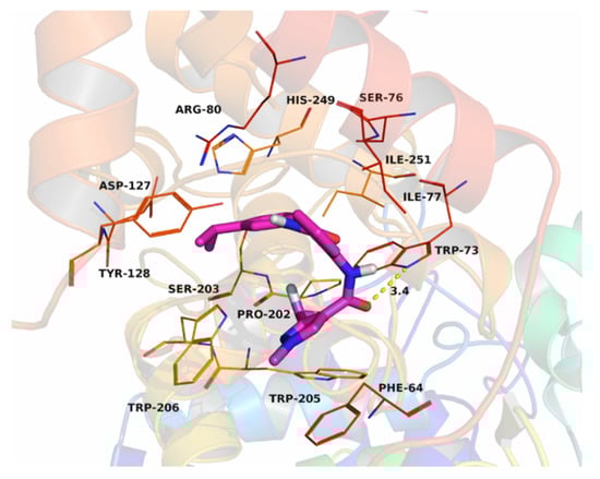 To further survey whether the SDH is a potential target enzyme of benodanil-heterocyclic carboxamide hybrids or not, compound 17 was docked into the binding site of the SDH. The theoretical binding mode between 17 and SDH is shown in Figure 4. Compound 17 fit into the gap composed of subunit B, C, and D of SDH. The phenyl group in the middle of compound 17 occupied the hydrophobic pocket, which was composed of the residues B/Pro-202, B/Ile-251, C/Ile-77, and C/Trp-73, while the 3-(difluoromethyl)-1-methyl-1H-pyrazole scaffold of compound 17 located at another hydrophobic pocket, surrounded by the residues B/Trp-205, B/Trp-206, C/Phe-64, and C/Trp-73, formed a stable hydrophobic binding. A detailed analysis showed that a π–π stacking interaction was observed between the pyrazole group in compound 17 and the sidechain of the residue C/Phe-64. In addition, the isopropylphenyl group in compound 17 formed a cation–π interaction with C/Arg-80. Importantly, one hydrogen bond interaction was observed between compound 17 and the residue C/Trp-73 (bond length 3.4 Å), which was the main interaction between them (Figure 4). All these interactions helped compound 17 to anchor in the binding site of SDH.