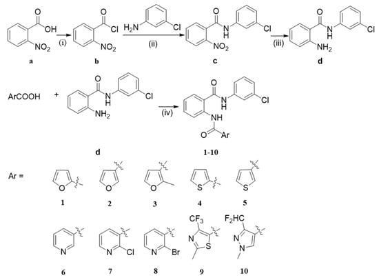 General synthesis of the target compounds 1–10. Reaction conditions: (i) SOCl2/CH2Cl2, 70 °C, 3 h; (ii) CH2Cl2, Et3N, 0 °C r.t., 3 h; (iii) Fe/NH4Cl, 75 % C2H5OH, 90 °C 3 h; (iv) EDCI/DMAP, DCM, r.t., 6 h.