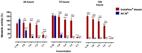 Observing the metabolic activity of cells treated with AH26®, after 24 h a decrease in the metabolic activity occurred for the concentrations of 1:8, 1:4, 1:2 and 1:1, with values of 42.82 ± 7.38% (p < 0.001), 8.36 ± 3.07% (p < 0.001), 2.52 ± 0.78% (p < 0.001) and 2.02 ± 0.54% (p < 0.001), respectively. For a 72 h of incubation period, a decrease to only 12.71 ± 0.64% (p < 0.001), 0.93 ± 0.15% (p < 0.001), 0.66 ± 0.08% (p < 0.001) and 0.90 ± 0.12% (p < 0.001) was seen at the respective concentrations of 1:8, 1:4, 1:2 and 1:1. Likewise, at 120 h of incubation, the metabolic activity was less than 1% (p < 0.001) in all concentrations tested.