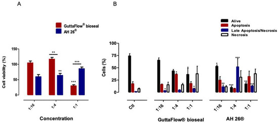 Cell viability and types of death are dependent on the concentration of the biomaterial, i.e., the lower biomaterial concentration, the lower cytotoxicity. The evaluation of cell death to GuttaFlow® bioseal at 1:16 shown to be the most similar to the control group, both in cell viability and in types of death. With an increase in concentration, there is a decrease in living cells and an increase in apoptosis first and in late apoptosis/necrosis later. Therefore, this material induces lower cell death, being less cytotoxic than AH26®. With the latter, a decrease in living cells to shallow values at all concentrations is observed, accompanied by a great increase in late apoptosis/necrosis.