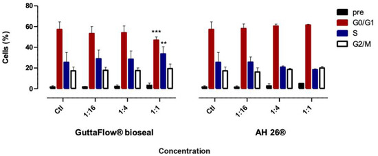 GuttaFlow® bioseal at the highest concentration (1:1) determined a decrease of cells in phase G0/G1, from 57.22 ± 7.29% to 46.88 ± 3.14% (p < 0.001), which was accompanied by an increase in phase S population cells from 25.50 ± 9.53% to 33.66 ± 6.87% (p = 0.0017). Though, on exposure to AH26® conditioned media at all concentrations, no significant changes were observed.