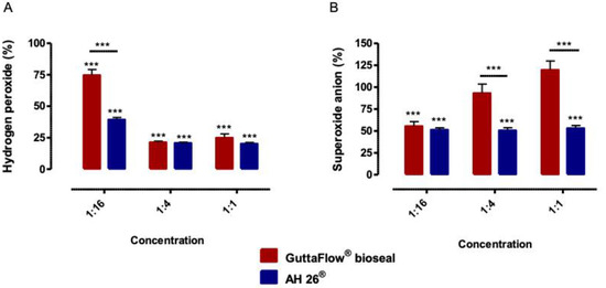 GuttaFlow® bioseal led to a decrease of hydrogen peroxide production to 74.66 ± 4.49% (p < 0.001), 21.36 ± 0.93% (p < 0.001) and 24.86 ± 3.75% (p < 0.001), for the concentrations of 1:16, 1:4 and 1:1 respectively, as observed in Figure 4.