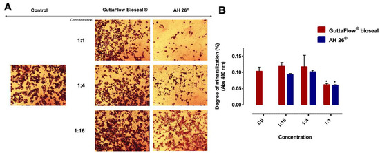 However, no marked differences were observed among conditions. For the highest concentration (1:1), a decrease in absorbance of 0.10 ± 0.01% to 0.06 ± 0.004% (p = 0.031) and to 0.06 ± 0.002% (p = 0.038) was observed, in the case of GuttaFlow® bioseal and AH26®, respectively.