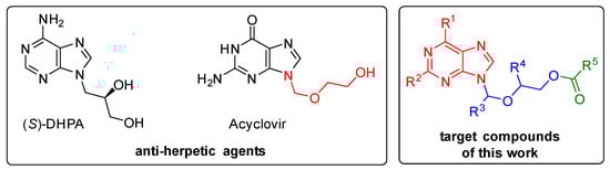 Structurally modified nucleosides and nucleotides belong to the most studied class of biologically active compounds, especially for their potential antiviral and anticancer properties [1,2,3,4]. Among them, so called acyclic nucleoside and nucleotide analogues have played an important role in the combat with various viral infections [3,5,6]. Acyclic nucleosides (acyclonucleosides), in general, are defined as heterocyclic compounds (usually nucleobase or modified nucleobase) containing one or more functional groups (usually hydroxyls) on the aliphatic side chain. The discovery of acyclovir (Zovirax) [7,8,9] and (S)-DHPA [10], the active ingredient of Duviragel (marketed in former Czechoslovakia), as anti-herpetic drugs (Figure 1), sparked the real interest in synthesis and biological evaluation of various types of acyclonucleosides.