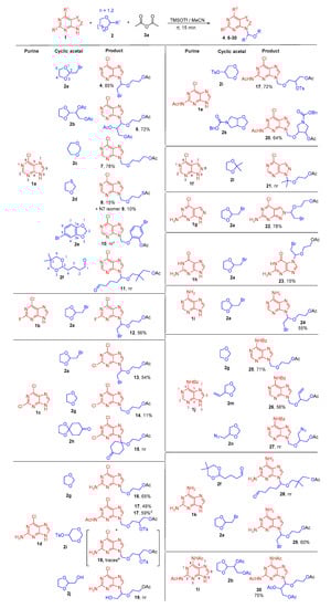 Preparation of acyclonucleosides by multi-component reaction—the scope of purines and cyclic acetals a,b. a General procedure B. b Isolated yields. c nr—no reaction. d 2.0 equivalent of acetic anhydride used. e traces—detected by UPLC-MS, not isolated.