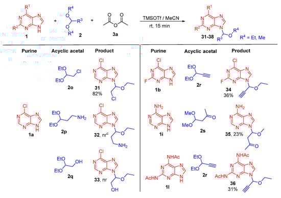 Preparation of acyclonucleosides by multi-component reaction—the scope of purines and acyclic acetals a,b. a General procedure B. b Isolated yields. c nr—no reaction.