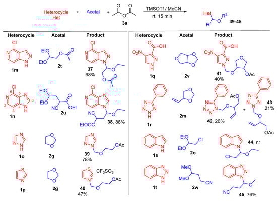 In order to extend the substrate scope of the studied synthetic procedure, reactions of various N-heterocycles with selected cyclic and acyclic acetals were carried out next (Scheme 4). The reactions afforded acceptable to high yields (21–88%) of target compounds, no reaction was observed only in the case when 1H-indole (1s) and acetal 2o were used as reaction partners. However, when the hydroxyl group of acetal 2q (Scheme 3) was acetylated, as in acetal 2t (Scheme 4), desired alkylated product 37 was isolated in a 68% yield. The best yield (88% of 38 as inseparable mixture of diastereoisomers) was obtained during the reaction of 3-deazapurine derivative 1n with racemic acetal 2u, which contains both nitrile and ester groups, demonstrating that these functional groups were well-tolerated.