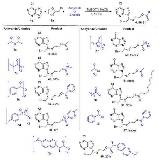 The last goal of the study was to test whether different anhydrides of carboxylic acids or even acyl chlorides could be exploited for such methodology (Scheme 5). For this purpose, our model reaction of 6-chloropurine (1a) with 2-bromomethyl-1,3-dioxolane (2a) under standard reaction conditions (general procedure B) was chosen, where acetic hydride (3a) was replaced by other anhydrides or acyl chlorides.