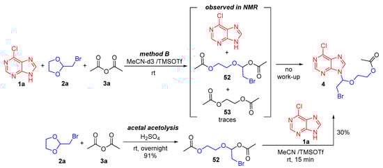 In order to reveal the plausible reaction mechanism, the reaction (general procedure B with 1a, 2a, and 3a) was run in deuterated MeCN directly in the NMR tube. Intermediate 52 (Scheme 6) was observed immediately after the reaction set up, together with a small amount of ethylene glycol diacetate (53) formed as a by-product (its structure was compared with commercially available sample). In order to confirm the structure of compound 52, it was prepared independently in a 91% yield by treatment of 2-bromomethyl-1,3-dioxolane (2a) and acetic anhydride (3a) in the presence of sulfuric acid (a modified procedure of Rosowsky et al. [28] for the preparation of 2-acetoxyethyl acetoxymethyl ether). Compound 52 was fully characterized and its NMR spectra were identical with those of the intermediate observed during the NMR experiment. Thus, the first reaction step of the synthesis of acyclic nucleosides is acetolysis of the corresponding acetal, in this case of compound 2a. We also performed reaction of compound 52 with 6-chloropurine (1a) and TMSOTf (1.5 equivalent) in MeCN (analogy to general procedure B) and product 4 (Scheme 6) was isolated in a 30% yield. Thus, the multi-component one-pot approach affords much better yields of the target compound 4 (85% versus 30%) and eliminates the reaction step needed for preparation of the alkylating agent (e.g., compound 52).
