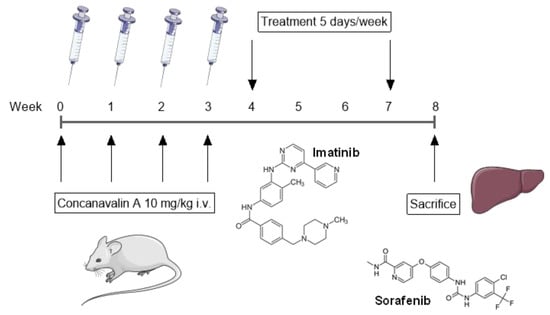 - Neef, M.; Ledermann, M.; Saegesser, H.; Schneider, V.; Widmer, N.; Decosterd, L.A.; Rochat, B.; Reichen, J. Oral imatinib treatment reduces early fibrogenesis but does not prevent progression in the long term. J. Hepatol. 2006, 44, 167–175. [Google Scholar] [CrossRef]