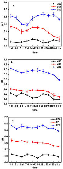 However, compared to BS the pH changes of VS and RS were different during aging process, mainly related to differences in soil types and properties. After biochar treatment and aging, the pH of VS1, VS2, RS1 and RS2 rapidly increased on day 1, then slowly decrease during the by one-year aging process (Figure 2b,c). Previous studies have shown that BC during the 72-day aging process had the effect of improving the soil pH, particularly in the early stage [48]. Wang et al. [33] showed that pH rapidly decreased from 0 to 30 days and slowly decreased from 31 to 95 days. Xu et al. [49] showed that pH (BC) value decreased from 8.20–10.7 to 7.5–9.7 after a 25-cycle aging test with BC, which can explain the soil slow decreased for pH during aging process (Figure 2).Furthermore, in a field experiment under a cucumber–sweet potato–rape rotation, Jiang et al. [44] showed that BC application can alter the soil acidity, while the natural aging of biochar in soil, cause the pH of soil to slowly decrease.