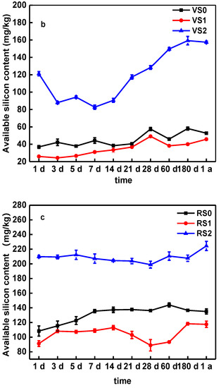 Similarly, compared to VS0 and RS0, the available silicon of VS2 and RS2 significantly increased by 87–228% and 46–94%, respectively, with the application of BC600 (Table S5). This result is due to the fact that Si the major component of the ash and BC derived from BC600 had a higher Si content, thus resulting in enhanced Si available for the lower Si soils, such as VS and RS. Previous studies have shown that BC can be used as a Si pool. It supports the dynamic process of Si release from BC modified soil [11,12,32,52].