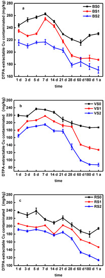 The change of DTPA-extractable Cu concentration in BS (a), VS (b) and RS (c) soils amended with biochars. Note: Error bars are standard deviations of the means (n = 3).