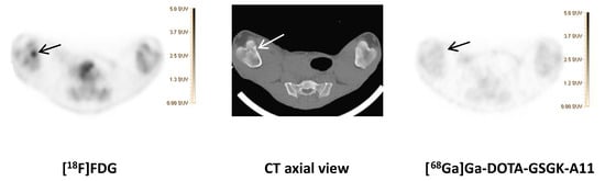 [68Ga]Ga-DOTA-GSGK-A11 compared to [18F]FDG.
