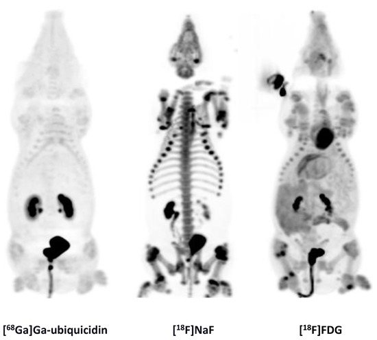 MIPs of [68Ga]Ga-ubiquicidin, [18F]NaF, and [18F]FDG.
