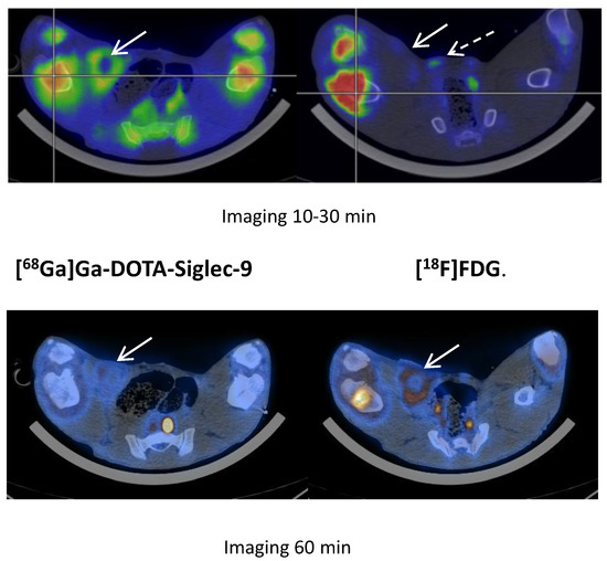 We also examined the vascular adhesion protein 1 (VAP-1)-targeted PET tracer [68Ga]Ga-DOTA-Siglec-9, as an alternative to the traditional tracers for detecting infections. Sialic acid-binding immunoglobulin-like lectin 9 (Siglec-9) is a natural ligand for VAP-1 and is expressed on monocytes and neutrophils and is involved in leukocyte trafficking [13].