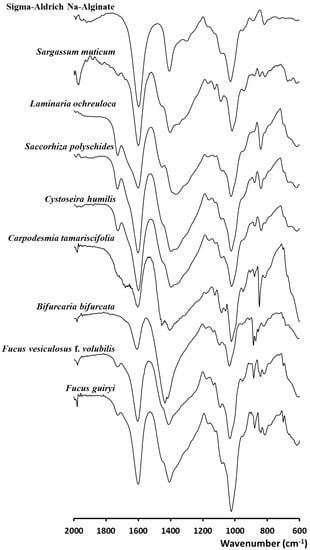 The infrared spectra in the range 2000 to 600 cm−1 of alginates extracted from the investigated brown algae with reference to commercial sodium alginate (Sigma-Aldrich, Gillingham, UK) are given in Figure 1. The spectra of extracted alginates are very similar to those of the commercial standard showing similar positions of the characteristic bands. Therefore, sodium alginate is the main polysaccharide found in the tested brown seaweeds, despite the small-signal appearing between 1710 cm−1 and 1730 cm−1, particularly in the spectra of Fucus guiryi, S. muticum, S. polyschides, L. ochroleuca, and F. vesiculosus, corresponding to the carbonyl group as the carboxylic acid ester form (C=O). The abroad bands at 1600–1610 cm−1 were suggested as the O-C-O carboxylate asymmetric stretching [23,24]. The bands located at 1400–1428 cm−1 were assigned to C-OH deformation vibration with the involvement of the symmetric stretching vibration of O-C-O [13,25]. According to previous reports, the bands at 1025–1030 cm−1 can be attributed to the C-O group [18]. The anomeric region (950 to 750 cm−1) is the most discussed in carbohydrates [23,26]. Indeed, the C-O stretching vibration of uronic acid residues is generally linked to the bands centered around 930–950 cm−1, and those recorded between 871 and 883 cm−1 were attributed to the C1-H deformation vibration of β-mannuronic acid residues [27]. The signals around 815–833 cm−1 were attributed to mannuronic acid residues [27].
