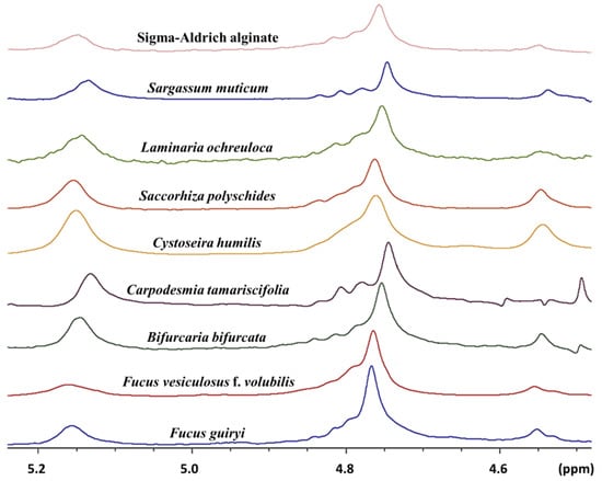 1H NMR spectroscopy is a consistent method for the complete characterization of the composition and the block structure of alginate [11,12]. The phycocolloids extracted from the studied brown algae revealed typical 400 MHz-1H NMR spectra (Figure 2) similar to the commercial sodium alginate with three key signals attributed to the anomeric hydrogen of guluronic acid (G) at 5.1–5.2 ppm (pic I), the anomeric hydrogens of mannuronic acid (M1), and the H-5 of alternating blocks (GM-5) overlapping at 4.7–4.9 ppm (pic II), and the H-5 of guluronic acid residues in the homopolymeric G blocks, at 4.5–4.6 ppm (pic III) (Figure S1 in the Supplementary Material).
