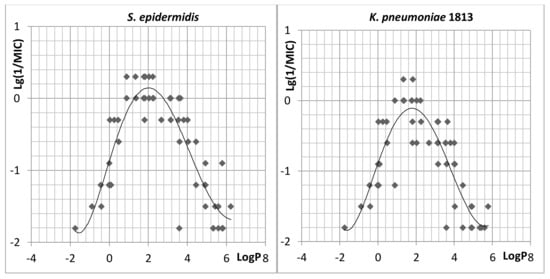 To identify quantitative relationships “structure–antibacterial activity” in a series of synthesized QACs based on vitamin B6 derivatives 5a8–5r18, the dependences of antibacterial activity on calculated in ChemAxon lipophilicity [22] were evaluated (Figure 2, for S. epidermidis and K. pneumoniae 1813). A strong correlation between the lipophilicity and antimicrobial activity of quaternary ammonium pyridoxine derivatives on S. epidermidis and K. pneumonia was observed. Thus, all the most active compounds had logP values in the range of 1–3, while compounds with logP > 6 and logP < 0 were almost inactive. Similar relationships were found for the other studied bacteria. Apparently, relationships reflect the important features of the active compounds essential for their effective interaction with the hydrophobic membrane core of bacterial cells.