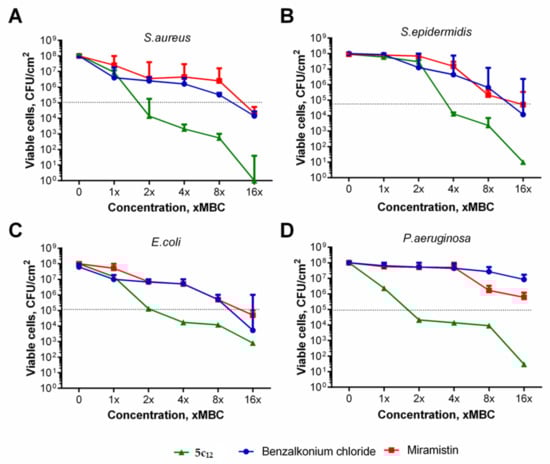 In these experiments, 5c12 exhibited higher activity compared with the reference antimicrobials: a 3-log drop of CFUs of these bacteria was observed at 2 × MBC of 5c12 (Figure 3), while 8 × MBCs of both benzalkonium chloride and miramistin were required to obtain the same effect. Moreover, both reference antimicrobials were less active against P. aeruginosa biofilm even at 16 × MBC, while 5c12 reduced the CFUs number by three orders of magnitude at 8 × MBC (Figure 3D). Thus, 5c12 demonstrated anti-biofilm activity comparable or even higher than that of the benzalkonium chloride.