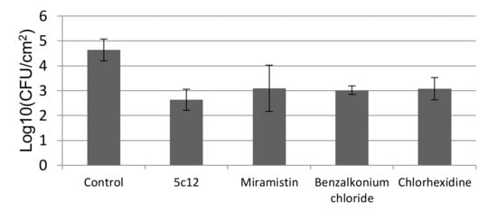 In vivo antibacterial efficacy test (Mean ± SD) using a rat skin model. log10 number of viable cells in the control and the number of viable cells after exposure with 5c12, miramistin, benzalkonium chloride, and chlorhexidine, n = 6.