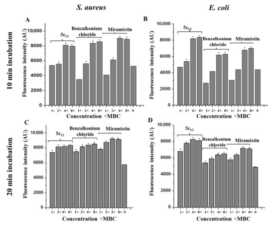 The effect of 5c12 on the electric potential of the bacterial membrane determined using a membrane-potential-sensitive cyanine dye DiSC3(5) (10 min treatment by 1–8 × MBC (A,B) and 20 min treatment by 1–8 × MBC (C,D)). Asterisks denote a statistically significant difference in comparison with untreated cells. * statistically significant difference from the control.