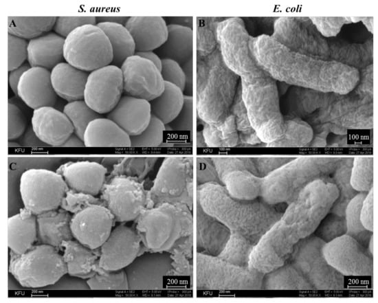 Thus, while the untreated S. aureus cells had a spherical regular shape with a dense surface with small gentle tubercles without vortices, dead cells were not detected in the visual fields (Figure 6A). After 5c12 treatment, dead cells with a shrunken cell membrane were observed. The shape of most cells became non-spherical and irregular with a losing surface and organic matter on most of the cells, possibly due to damage of the cytoplasmic membrane and leakage of internal contents (Figure 6C). A number of cells exhibited deep creases, which indicated the folding of the cell wall into the cell due to the outflow of cytoplasm. In contrast to S. aureus, untreated E. coli cells had a wrinkled surface (Figure 6B). After 5c12 treatment, the cell surface became more spongier due to this, which indicated the change in the structure of the cell wall (Figure 6D).