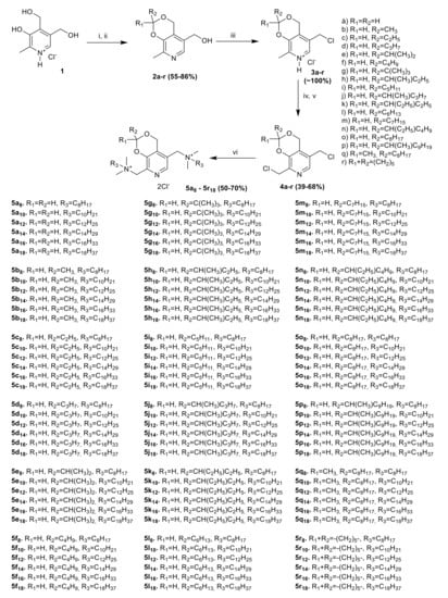 - Shtyrlin, Y.G.; Shtyrlin, N.V.; Sapozhnikov, S.V.; Pavelyev, R.S. Method of producing 5,8-(bis(methylene(N,N-dimethyl-N-dodecylammonium))-2-ethyl-4H-[1,3]dioxino[4,5-c]pyridinium dichloride. Application RU No. 2,697,848 C1, 21 August 2019. [Google Scholar]