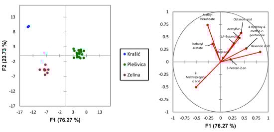 One hundred and seventy-one volatile compounds presented in sparkling wines from three different Zagreb county vine-growing regions were detected, quantified and classified into several chemical classes (aldehydes, higher alcohols, volatile phenols, terpenes, C13-norisoprenoids, lactones, esters, fatty acids, sulfur compounds, other compounds, other alcohols). In Table 2, the average values of main volatile compounds chemical classes are presented, showing a significant difference among vine-growing regions while individual volatile compounds are presented in Table 3. The most abundant class was higher alcohols group with the highest concentrations of isoamyl and phenylethyl alcohol as well as 2-methyl-1-butanol. Comparing these compounds among vine-growing regions shows that sparkling wines from Zelina had significantly the highest concentrations. Data from the work by Torrens et al., Caliari et al., and Torchio et al. [9,25,26] also showed that major aromatic compound was phenylethyl alcohol, with OAV > 1 having influence on the sweet, rose and honey aroma structure of sparkling wines. The concentrations of higher alcohols not exceeding the amount of 300 mg L−1 can positively influenced the formation of wine complexity [27] which was not the case in our samples. Besides above mentioned compounds cis-3-hexene-1-ol, had also an impact on “green grass” odour profile of Zagreb county sparkling wines, especially in some samples from Plešivica vine-growing region. Representatives of alcohols that are also characterized by “green” and “herbaceous” notes, such as trans-1-hexanol, and cis-2-hexene-1-ol, and trans-3-hexen-1-ol, which are mostly synthetized during the pre-fermentation wine production process, were detected, but in concentrations under the defined odour threshold value in all sparkling wines samples analysed. Yeast contact and storage time on lees during sparkling wine production might have been the reason for relatively higher concentrations of 1-hexanol that ranged from 1612 to 2948 µg L−1, concentrations that are in agreement with data reported by [28]. As it can be seen from the Table 3, the presence of 1-hexanol was significantly the highest in sparkling wines from Krašić while there were no marked differences between other two regions. According to Alexandre et al. [29] and Benucci et al. [30], esters are the main class of aroma compounds released by the degradation of yeast cells having low perception thresholds and so positively contributing to the aroma of fruit as well as floral-like aroma of sparkling wine. Significantly, the highest amount of esters was detected in sparkling wines from Zelina while there was no marked difference between the other two vine-growing regions. Also, it can be seen that total esters concentration was more or less similar or something higher when compared to the data published by Benucci et al. [30]. Among esters presented in the analysed sparkling wines, the most common were diethyl succinate, ethyl hydrogensuccinate, and ethyl lactate, which is comparable with the results published in the work by Benucci et al. [30], while the ones with the OAV > 1 were ethyl butanoate, hexanoate, octanoate, ethyl-2-methylbutanoate, ethyl-3-methylbutanoate, isoamyl acetate, and isoamyl lactate. Comparable results were achieved by Voce et al. [19] in Ribolla Gialla sparkling wines where esters had an important role in volatile profile structure. Ethyl decanoate (floral) and 2-phenylethyl acetate (scent of rose) were detected in all sparkling wines in concentrations under the odour threshold values but according to Genovese et al. [31] these compounds can show synergistic effect even at low concentrations. The concentrations of 2-phenylethyl acetate published by Torchio et al. [26] were comparable with our data (23.40 to 28.73 µg L−1). According to Torrens et al. [9] and Riu-Aumatell et al. [11] diethyl succinate and ethyl lactate are considered as “ageing esters” whose concentrations can increase in contact with yeast cells during the second fermentation. For the development of cava, diethyl succinate can be used as a marker, mainly connected with the period of cava storage in the cellar [11]. In Zagreb county sparkling wines its concentrations were between 3917.45 µg L−1 (Krašić) up to 7430.69 µg L−1 (Zelina) which is compared to Ribolla Gialla wines (2555 µg L−1) higher but compared to concentrations published by Martinez-Garcia et al. [32] ranging between 8900 µg L−1 and 15,000 µg L−1 much lower. Among other ester compounds detected in Zagreb county sparkling wines isobutyl lactate, ethyl-2-hydroxy-3-methylbutanoate, diethyl hydroxysuccinate and isobutyl lactate concentrations were significantly higher in Zelina vine-growing region wines while ethyl vanillate, phenyl acetate and ethyl-hydroxyhexanoate concentrations were significantly the highest in wines from Plešivica vine-growing region. In analysed sparkling wines, the presence of diethyl glutarate and diethyl malonate, compounds, whose concentrations are influenced by yeast autolysis or caused by chemical esterification during the ageing process, was detected. By the use of chemometric analysis, diethyl malonate was pointed out as one of the most important compounds having strong influence in the Chardonnay wines differentiation [33]. In the work by Carlin et al. [34], the above mentioned compounds were also reported with concentrations of diethyl glutarate (5.8–7.3 µg L−1) similar to our data (12.0–19.9 µg L−1). Sparkling wines from Krašić stood out with significantly the highest concentration of diethyl malonate, while there was no significant difference in diethyl glutarate concentrations among tested wines. Terpens as a large group of wine aroma compounds primarly characterized by floral aroma are translocated from the grape to the must during the pressing and settling process in free volatile form or bound to sugars. In wines, according to