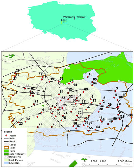 - Statistical Office in Łódź. Data on Łódź. Geography, Meteorology. Geographic Location of the City. Available online: https://lodz.stat.gov.pl/en/information-about-voivodship/capital-of-voivodship-614/data-on-lodz-2018/ (accessed on 18 June 2020).