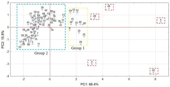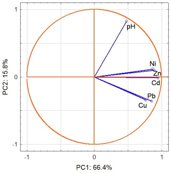 Following PCA, two main components (first principal component (PC1), second principal component (PC2)), which together account for over 80% of the data variability, were extracted. PC1 includes all investigated metals. Their factor loadings are within the range from 0.95 for Cd to 0.76 for Cu, whereas pH is involved in PC2 (factor loading is 0.82). PC2 has also weak loadings for Cu and Pb (factor loadings –0.34 and –0.36, respectively) and PC1 for pH (factor loading 0.48). The graphic representation of the main components is presented in Figure 4, which depicts the relations between variables in two-dimensional space. The score plot (Figure 5) shows that sampling points could be generally divided into two main groups (1 and 2). Five outliers (2,4,44,49,52) with the highest positive PC1 factor values can be identified. Sites 2 and 52 have also the lowest and site 44 the highest PC2 values. All outliers represent highly contaminated hot-spots (Figure 3b,c) of anthropogenic origin and are vital for the thorough characterization of investigated area. Following Abollino [62] on treatment of outliers in the field environmental studies, we decided to use complete dataset in PCA and CA calculations. At given locations, the content of at least two metals corresponds to considerable (CF 3-6) or high (CF > 6) contamination [59] further confirmed by high PLI values. In points 2, 44 and 49 PLI is within the range 3–5, while in sites 4 and 52 it exceeds 5. Group 1 consists of samples with highly positive PC1 values. With the exception of sites 6, 24, 25, and 32, PC2 values are positive. All samples are considerably or highly contaminated with lead and copper (a few also with zinc) and have PLI values in the range 2–3.