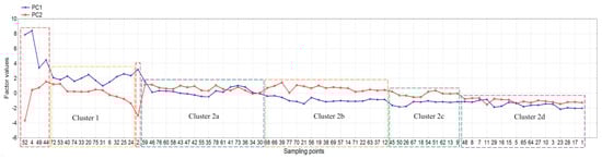 Factor values obtained from principal component analysis (PCA) for sampling points and classified according to the cluster analysis (CA) results.