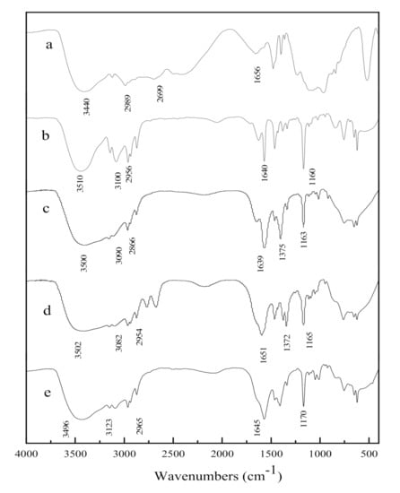 FT-IR spectra of ChOH (a), [Bmim]Br (b), [Bmim][HCOO] (c), [Bmim][CH3COO] (d) and [Bmim]OH (e).