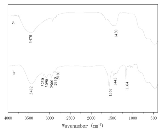 FT-IR spectra of CaMgAl hydrotalcites before and after intercalation by ionic liquid were shown in Figure 4. The absorption peak of pure hydrotalcites at 3470 cm−1 was related to hydroxyl stretching vibration linked to metal cations. The absorption vibration peak of carbonyl in carbonates was observed at 1430 cm−1. The characteristic peaks of imidazole ionic liquid appeared, obviously, on the infrared spectrum of hydrotalcites after intercalation by [Bmim]OH. The absorption peaks at 3250 cm−1 and 3090 cm−1 corresponded to the unsaturated C-H on imidazole rings. The stretching vibration peaks at 2960 cm−1, 2930 cm−1 and 2880 cm−1 were attributed to the saturated carbon-hydrogen bond on the branch chain of imidazole rings. The absorption peaks at 1567 cm−1 and 1164 cm−1 were ascribed to C=N and C-C on imidazole rings, respectively. All indicated that [Bmim]OH had been intercalated into hydrotalcites successfully.