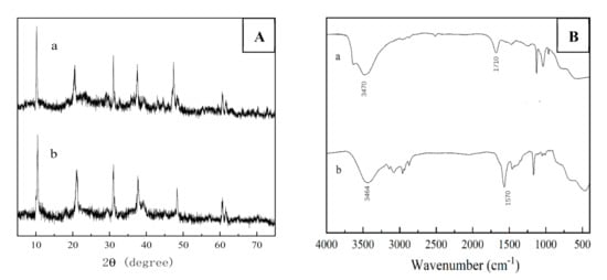XRD patterns (A) and FT-IR spectra (B) of five times reused catalyst (a) and fresh catalyst (b).