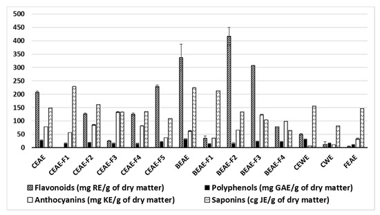 The polyphenol, flavonoid, anthocyanin and saponin contents of the extracts were assessed by colorimetric methods, as shown in Figure 1. According to our results, Bidens pilosa shows the highest flavonoid content. Indeed, the B. pilosa ethyl acetate extract (BEAE) of the plant has 337 mg g−1 rutin equivalents. Two fractions resulting from BEAE named BEAE-F2 and BEAE-F3 also reveal an interesting flavonoid content above 300 mg g−1 rutin equivalents. Similarly, C. inophyllum ethyl acetate extract (CEAE) is at 208 mg g−1 rutin equivalents and three of its resulting fractions CEAE-F2, CEAE-F4 and CEAE-F5 are at 127, 125 and 230 mg g−1 rutin equivalents, respectively. Both the C. inophyllum ethanol/water extract (CEWE) and aqueous extract (CWE), as well as the ethyl acetate extract of F. berteroana (FEAE), have values below 60 mg g−1 rutin equivalents. The polyphenol content of the extracts and fractions shows that CEAE, BEAE and CEWE have the highest values. The saponin content was of the same order of magnitude in all the extracts, ranging between 65 and 229 cg g−1 jujuboside equivalent. Nevertheless, the least polar fractions such has CEAE-F1, CEAE-F2, BEAE-F1 show a higher saponin content than the more polar fractions and extracts.