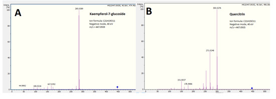UPLC-MS/MS fragmentation spectra of putative kaempferol-7-glucoside (A) and quercitrin (B) at 40 eV in negative ionization mode, m/z = 447.093 present in extracts of all three plant species. The blue diamond symbol represents the parent ion mass before MS2 fractioning.