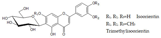 Flavonoids are polyphenolic compounds commonly found in plants and herbs. Their basic structure is a C6-C3-C6 pattern composed of two benzene rings surrounding a pyran ring. Further hydroxyl and methyl groups complexify the aglycone structure. Here, we first tentatively identified several O-glycosyl flavones and flavonols from our different extracts consisting of flavone aglycones with a sugar group attached to one of their hydroxyl groups.