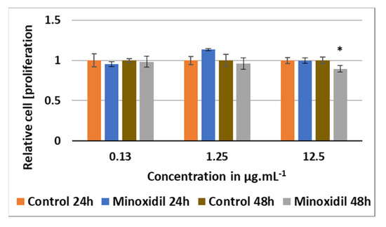Cell-proliferating effect of minoxidil after 24 h and 48 h of treatment of dermal papilla cells with concentrations 0.13, 1.25 and 12.5 μg mL−1 compared the control. Significance is determined by * p < 0.05, using a Student’s t-test.
