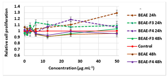 In summary, proliferation-inducing concentrations for FEAE and its fractions FEAE-F0, FEAE-F2 and FEAE-F3 range between 6.25 and 50 μg mL−1 for both time points. The optimal range is narrowed down between 6.25 and 25 μg mL−1 for FEAE-F1 and mirrors that of C. inophyllum extracts CEAE and CEWE and fractions CEAE-F4 and CEAE-F5. BEAE and fractions BEAE-F3 and BEAE-F4 (Figure 6) do not display an optimal range but rather punctual concentrations with proliferative activity.