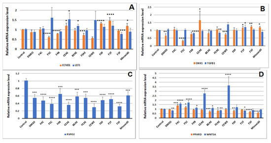CCND1 is a downstream target gene of the Wnt/β-catenin pathway. During Wnt activation, cytoplasmic β-catenin accumulates and then translocates to the nucleus where it binds to transcription factor Lef(1)/TCF [38,39,40]. The rate of change of the signaling factor stimulates the transcription of several genes, including CCND1 [41]. In other words, when Wnt is activated, there is an upregulation of LEF1 and CCND1 in DPCs. Interestingly, in Figure 8A, CEAE shows a significant increase in the expression of both CCND1 and LEF1, to 1.20 (p = 0.03) and 1.53 (p = 0.02), respectively. Other extracts increased CCND1 expression only, such as FEAE-F0, FEAE-F1 and minoxidil to 1.32 (p < 0.0001), 1.42 (p < 0.0001) and 1.19 (p = 0.03), respectively, or only LEF1, as BEAE increased to 1.19 (p = 0.02). It is noteworthy that CEAE-F5 and CEWE demonstrate the strongest yet non-significant increase in LEF1 to 1.63 and 1.50, respectively.