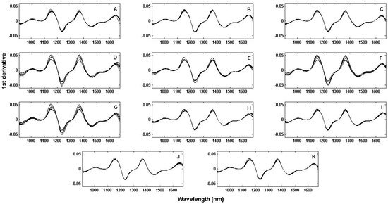 NIR spectra: (A) Control (i.e., antioxidant-free soybean oil); (B) BHT; (C) TBHQ; (D) Provençal herbs extract; (E) Dehydrated goji berry extract; (F) Pumpkin seed extract; (G) Poppy seed extract; (H) Provençal herbs; (I) Dehydrated goji berry; (J) Pumpkin seed; (K) Poppy seed.