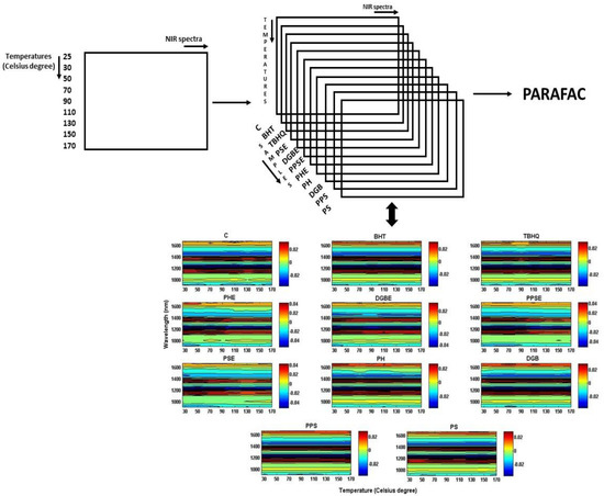 Scheme for illustration of the NIR spectra organization in n-way mode. C = Control (i.e., antioxidant-free soybean oil). BHT = butylated hydroxytoluene. TBHQ = tert-butylhydroquinone. PSE = Poppy seed extract. DGBE = Dehydrated goji berry extract. PPSE = Pumpkin seed extract. PHE = Provençal herbs extract. PH = Provençal herbs. DGB = Dehydrated goji berry. PPS = Pumpkin seed. PS = Poppy seed.