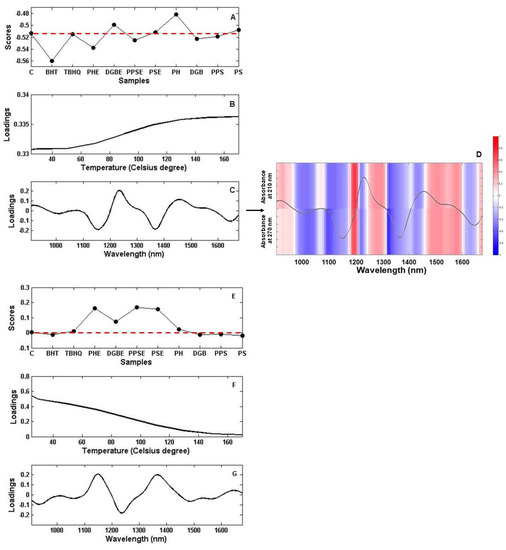 PARAFAC results. (A) Scores on factor 1. (B) Loadings on factor 1 related to temperature. (C) Loadings on factor 1 related to spectral mode. (D) Correlation map through samples relating the NIR spectra at 150 °C versus the ultraviolet univariate result. (E) Scores on factor 2. (F) Loadings on factor 2 related to temperature. (G) Loadings on factor 2 related to spectral mode. C = Control (i.e., antioxidant-free soybean oil). BHT = butylated hydroxytoluene. TBHQ = tert-butylhydroquinone. PSE = Poppy seed extract. DGBE = Dehydrated goji berry extract. PPSE = Pumpkin seed extract. PHE = Provençal herbs extract. PH = Provençal herbs. DGB = Dehydrated goji berry. PPS = Pumpkin seed. PS = Poppy seed.