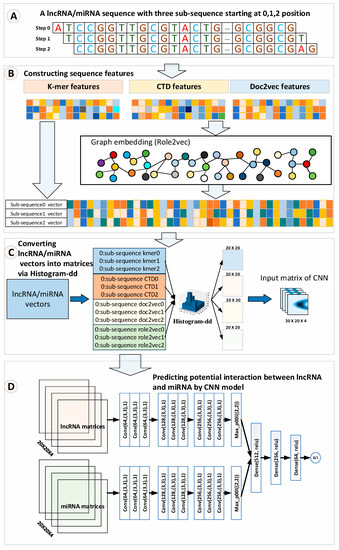 The overall workflow of LncMirNet. (A) Sub-sequence of a lncRNA/miRNA starting with position 0, 1, 2 respectively; (B) process to construct k-mer, CTD, and doc2vec and graph embedding features; (C) process to convert the lncRNA/miRNA vectors into a matrix; (D) process to predict potential interaction between lncRNA and miRNA by a CNN model.