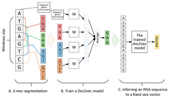 The training and inferring pipeline of doc2vec. (A) 3-mer segmentation process; (B) training process of a doc2vec model; (C) inferring process of doc2vec to encode a RNA sequence to a fixed-size vector.