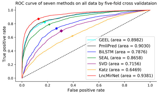 Receiver operating characteristic curves of seven methods on all data by five-fold cross validation.