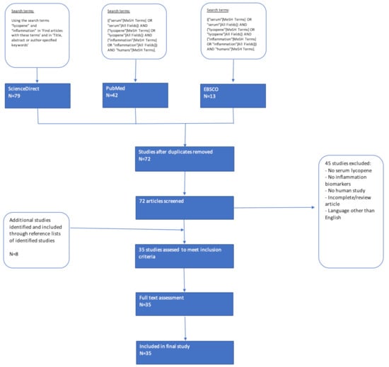 Various studies were seen to report merely the intake of lycopene and its relationship with inflammation biomarkers, whereas the main interest of this study is to identify actual levels of lycopene in plasma/serum detected after/following consumption. Therefore, when analyzing full text versions of all studies, studies were excluded from this assessment based on the following exclusion criteria: (i) Assessment of lycopene intake or general intake of carotenoids/antioxidants without measuring circulating lycopene; and (ii) no inflammation biomarkers reported as outcomes. In total, the screening and eligibility process of this literature search led to the identification of 35 studies that were included and subjected to critical analysis (Figure 1).