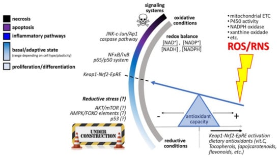 Hypothetical NAD(p) +/NAD(p)H-responsive redox switch of eukaryotic cells that triggers distinct phenotypic fates depending upon cellular redox balance. From a basal condition (optimum redox balance), the redox switch elicits inflammatory pathways, apoptosis, or necrosis, following increasing oxidative conditions, whereas unclear “reductive stress” mechanisms are triggered when NAD(p)H coenzymes prevail in cellular compartments. An increase of the cellular antioxidant capacity (from diet intake or generated endogenously) slides the antioxidant “seesaw” pivot point to the right, attenuating the magnitude of ROS/RNS production in the cell. However, an excessive antioxidant load in cells (sliding further to the right) could prevent beneficial processes mediated by the Nrf2−Keap1−EpRE system. This figure was adapted from reference [87].